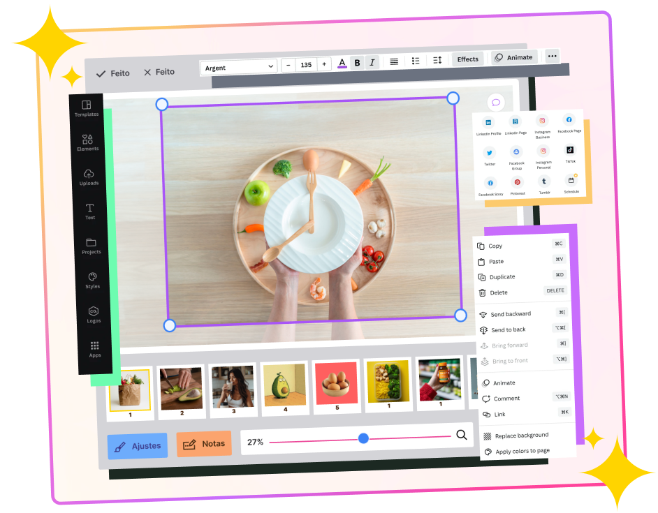 Explore uma biblioteca repleta de opções – desde imagens e textos até templates feito por nutricionistas.